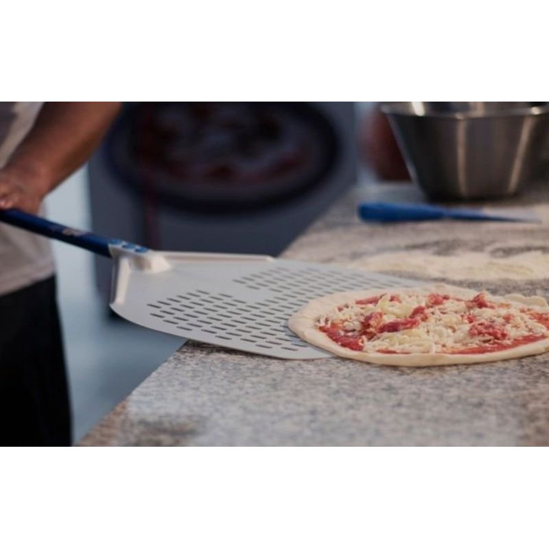 Pelle à pizza carrée en aluminium perforé, dimensions 33x33 cm, avec un manche de 60 cm. L'aluminium perforé permet une cuisson...