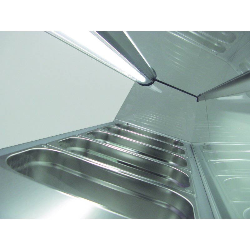 - Capacité : 5 bacs GN 1/3, profondeur 150 mm (bacs non fournis)
