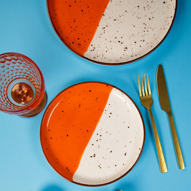 Son design raffiné associe une partie ivoire claire et une partie orange lumineuse pour des tables rayonnantes !