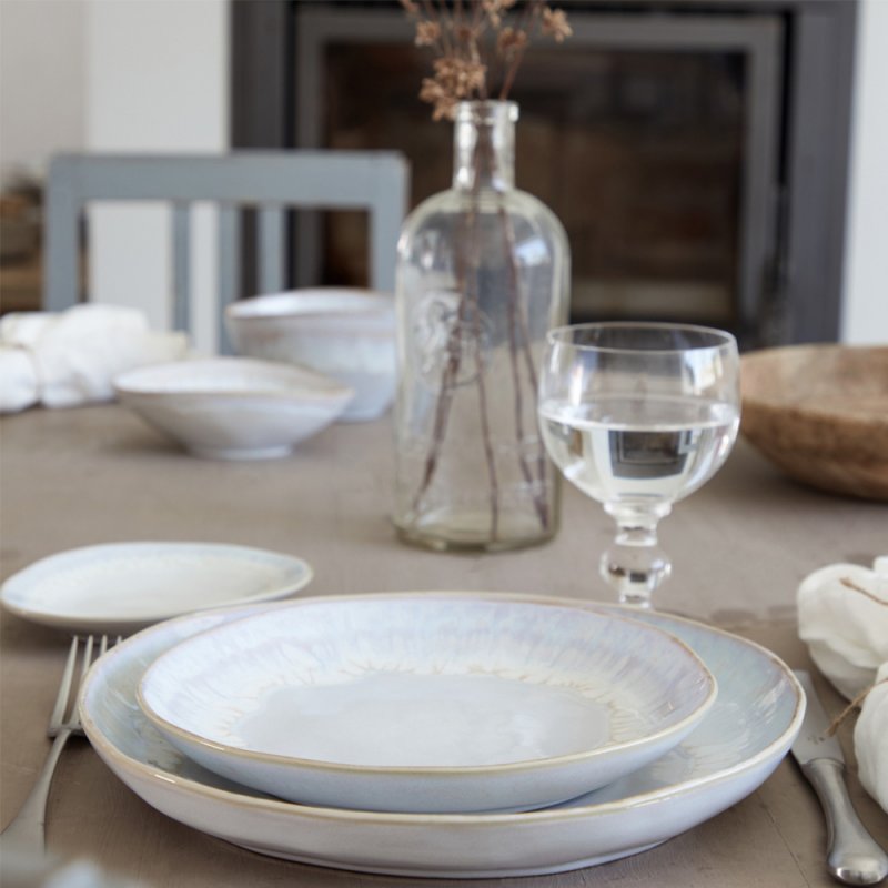 Cette assiette fabriquée à la main au Portugal en grès fin, présente des formes organiques inspirées de la côte de l'Algarve.