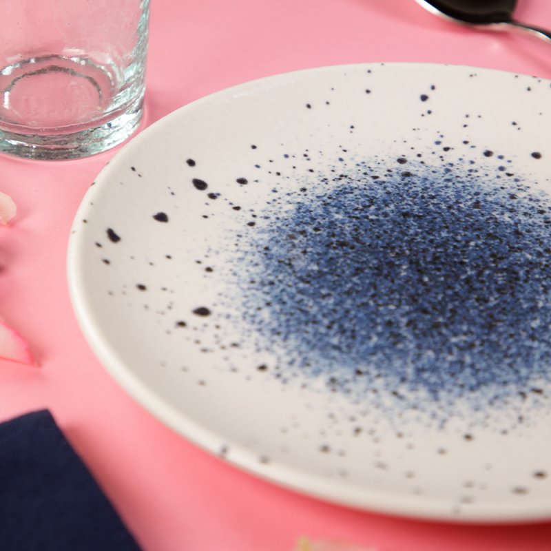 Son design raffiné associe une base blanche à des motifs bleus pour des tables rayonnantes !