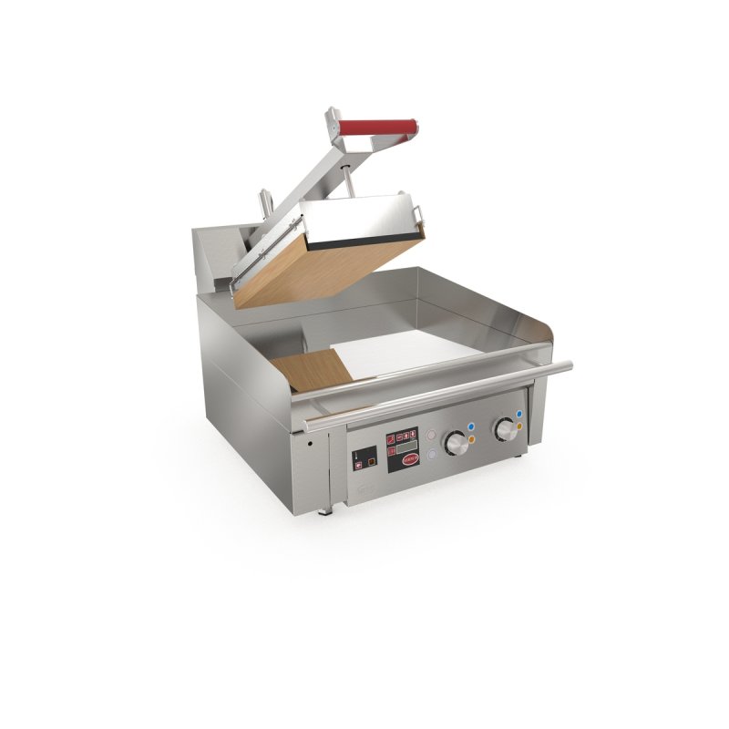Elle est équipée de deux programmes pour la presse, permettant un relevage automatique selon le programme choisi, ce qui réduit le temps de cuisson de 50%. Les commandes mécaniques pour la plaque et électroniques pour la presse offrent une utilisation intuitive et précise. Sa surface anti-adhérente facilite le nettoyage, rendant cet équipement indispensable pour les professionnels de la restauration. De plus, elle est livrée avec un tiroir à graisse de 4 litres et des accessoires pratiques tels que des tissus anti-adhérents en Teflon, un produit de nettoyage pour Teflon, une raclette, une brosse métallique et une spatule.