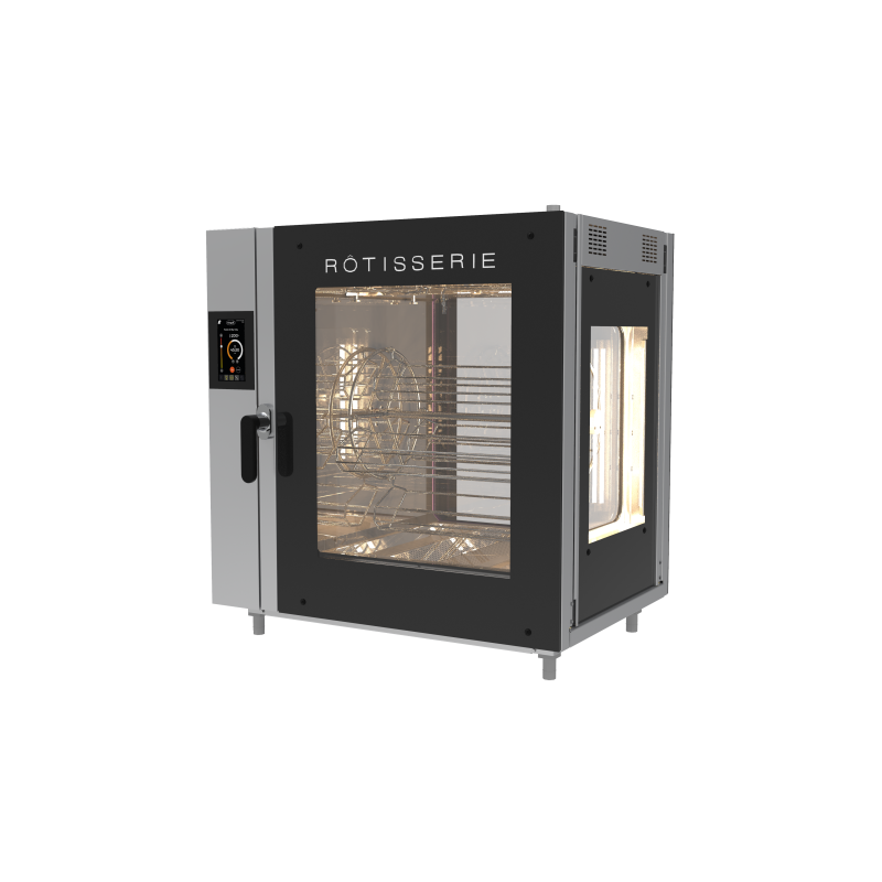 La rôtissoire IDEAL 4 S panoramique à balancelles 100 % autonettoyante est conçue pour les professionnels de la restauration souhaitant intégrer une solution premium et efficace pour la rôtisserie. Cet appareil est adapté pour la cuisson simultanée de différents types de viandes ou de volailles, tout en offrant une visibilité totale et une présentation attrayante des aliments grâce à son design panoramique.