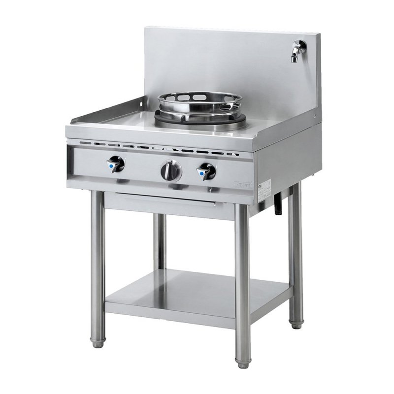 Cet équipement professionnel est équipé d'un dosseret arrière de 300 mm, d'un robinet d'eau froide avec commande en façade, et d'une rigole d’évacuation avec bonde de trop-plein. Le système de projection d’eau rasant permet le nettoyage et le refroidissement. Il est également doté d'un robinet gaz avec veilleuse et thermocouple de sécurité, d'un allumage manuel et d'un tiroir de récupération des résidus de cuisson.