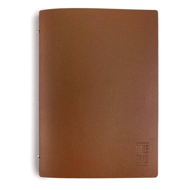 Découvrez notre porte-menu Simone marron format A4 fabriqué en cuir 100% recyclé, dimensions 25, 5x32 cm, idéal pour les professionnels de l'hôtellerie et de la restauration.
