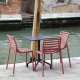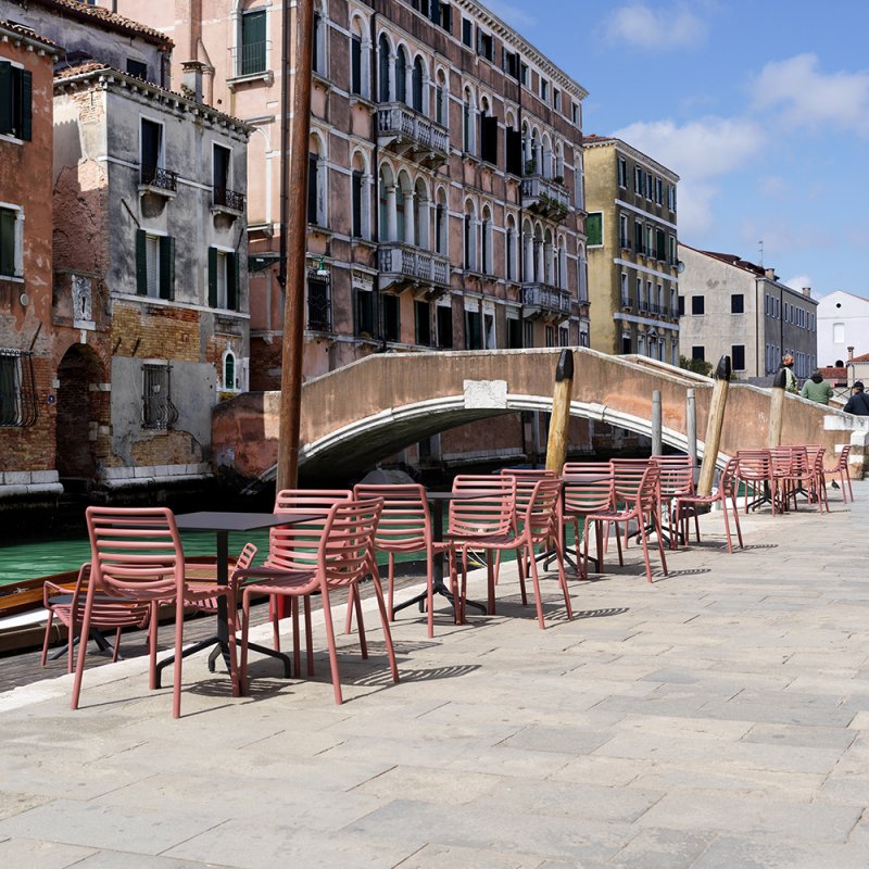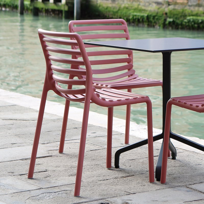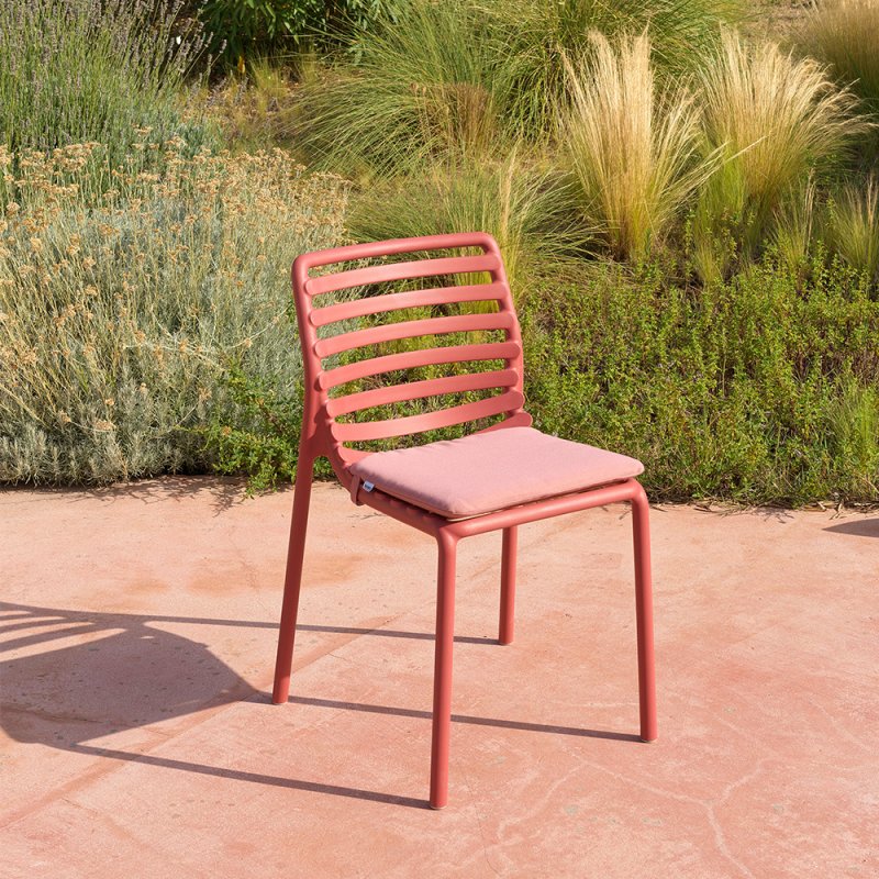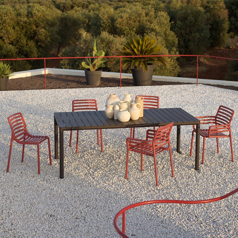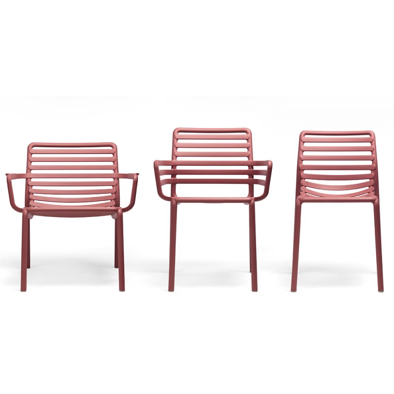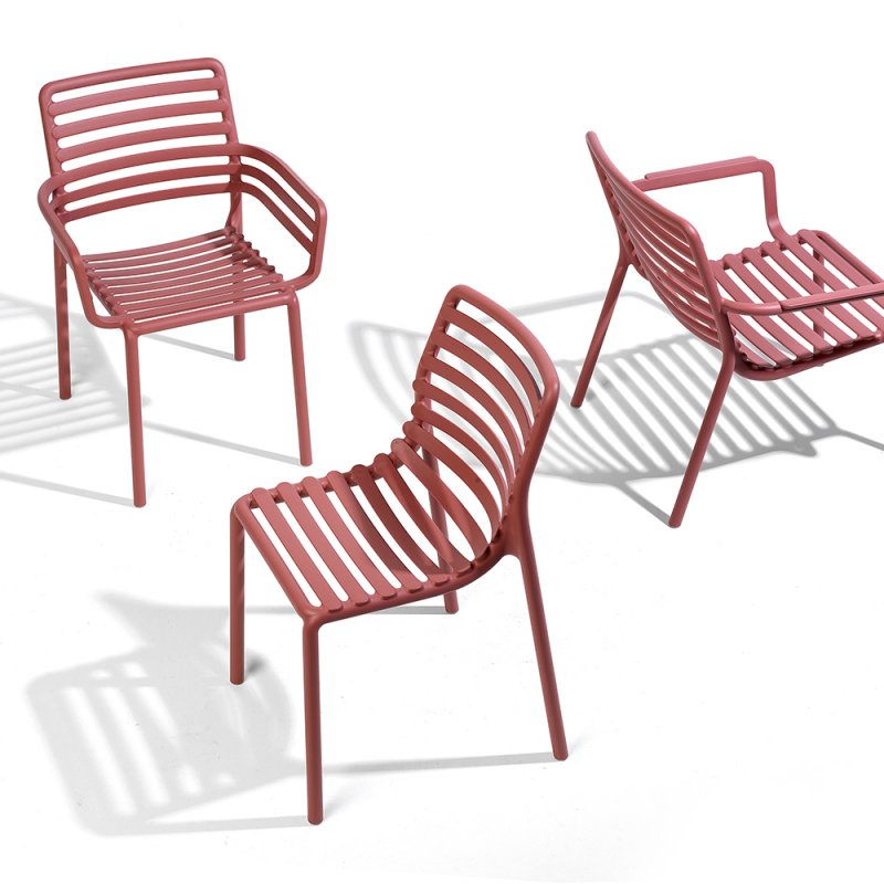 Frais, léger et ergonomique, DOGA est une collection d'extérieur en résine de fibre de verre, caractérisée par un jeu de lattes horizontales, revisitée avec une touche contemporaine.