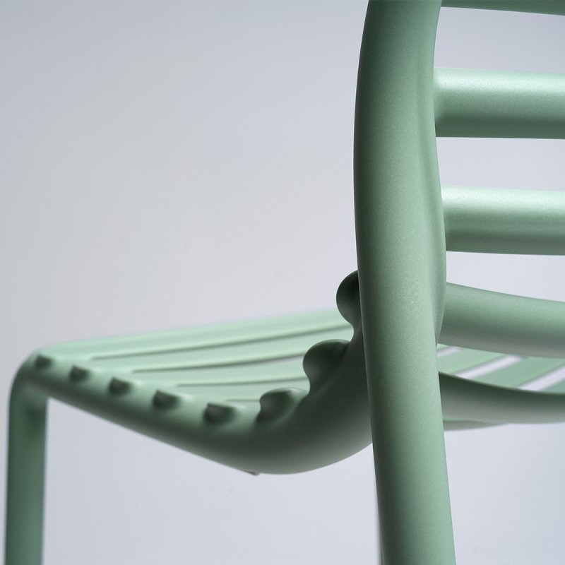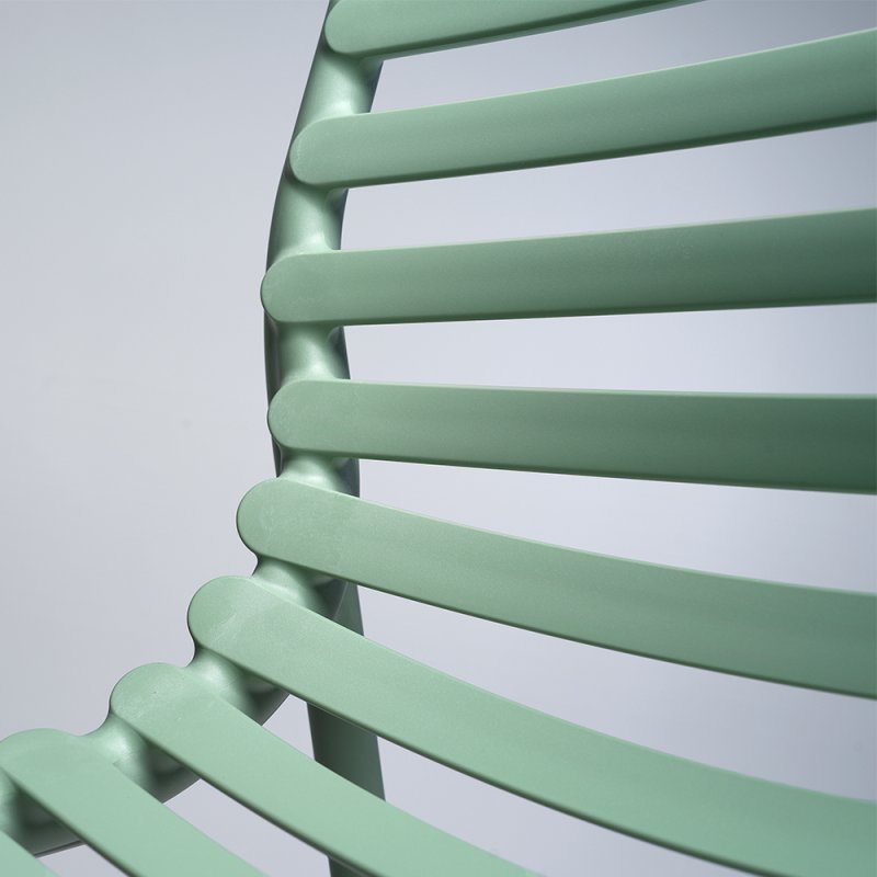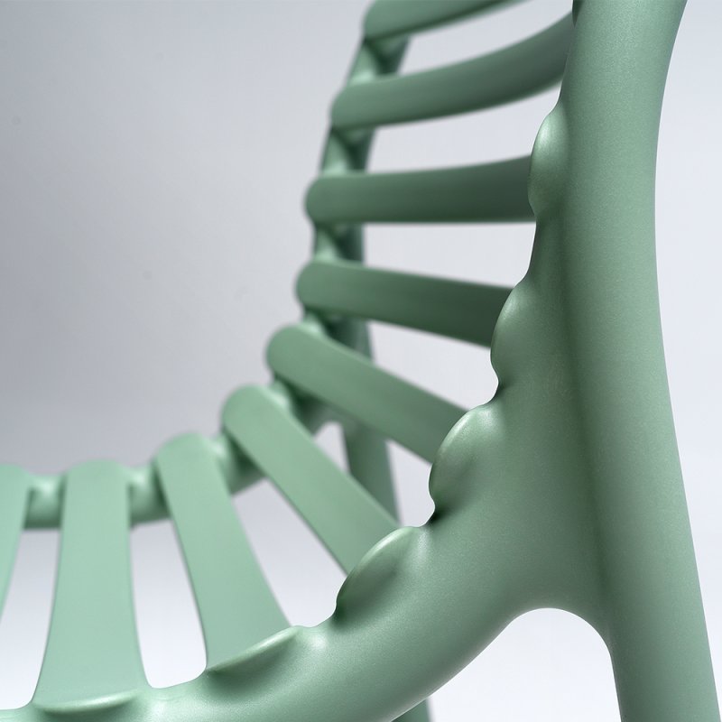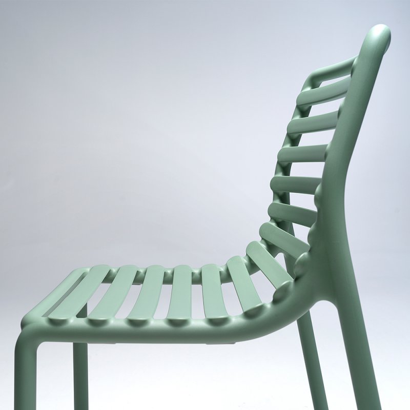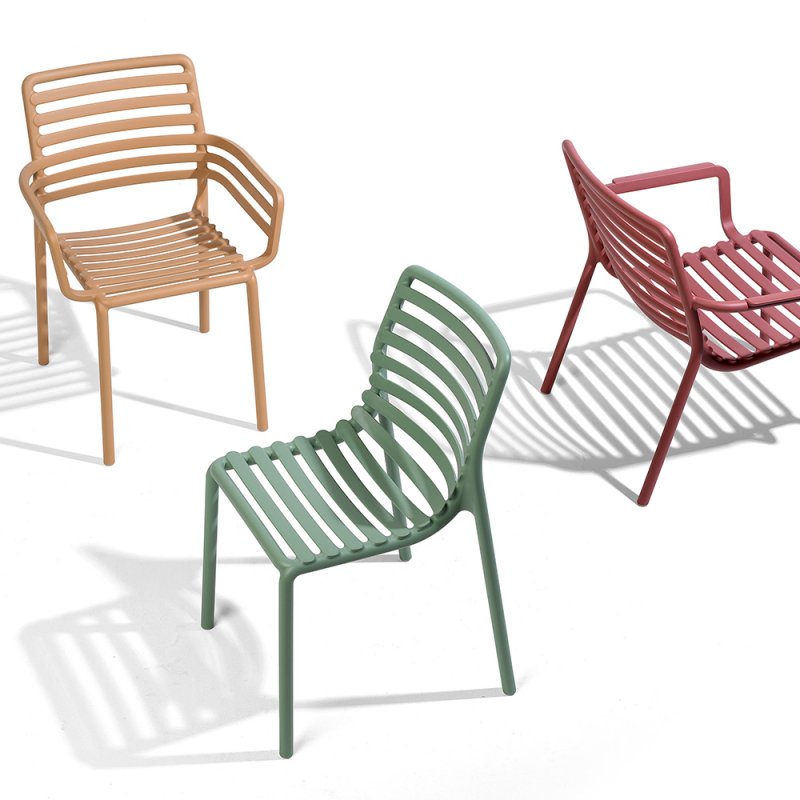Frais, léger et ergonomique, DOGA est une collection d'extérieur en résine de fibre de verre, caractérisée par un jeu de lattes horizontales, revisitée avec une touche contemporaine.