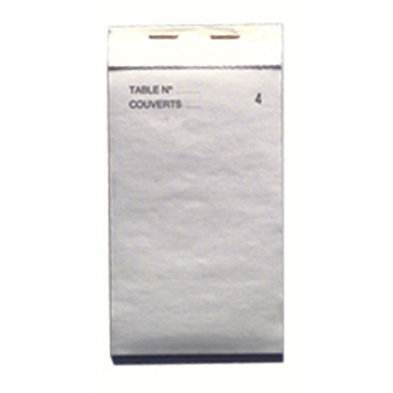 Bloc autocopiant de 50 feuillets en 2 exemplaires 1 exemplaire pour la table, 1 exemplaire à conserver en souche. Les 2 feuillets sont en papier blanc de 57g/m2 et 56g/m2 numérotés de 1 à 50, écriture libre pour tout type de notes, quel que soit le besoin du clients. Support en carton rigide, format adapté à une excellente prise en main, facile à glisser dans une poche de tablier. Un outil parfait pour les restaurants, cafés, pubs, hôtels. Fabrication 100% française