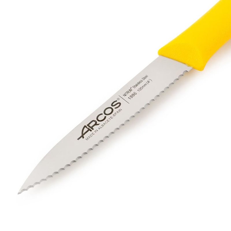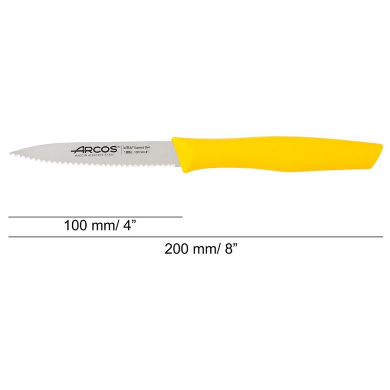Découvrez notre couteau d'office cranté jaune (lame de 10 cm) de la marque Arcos, un petit équipement de coutellerie...