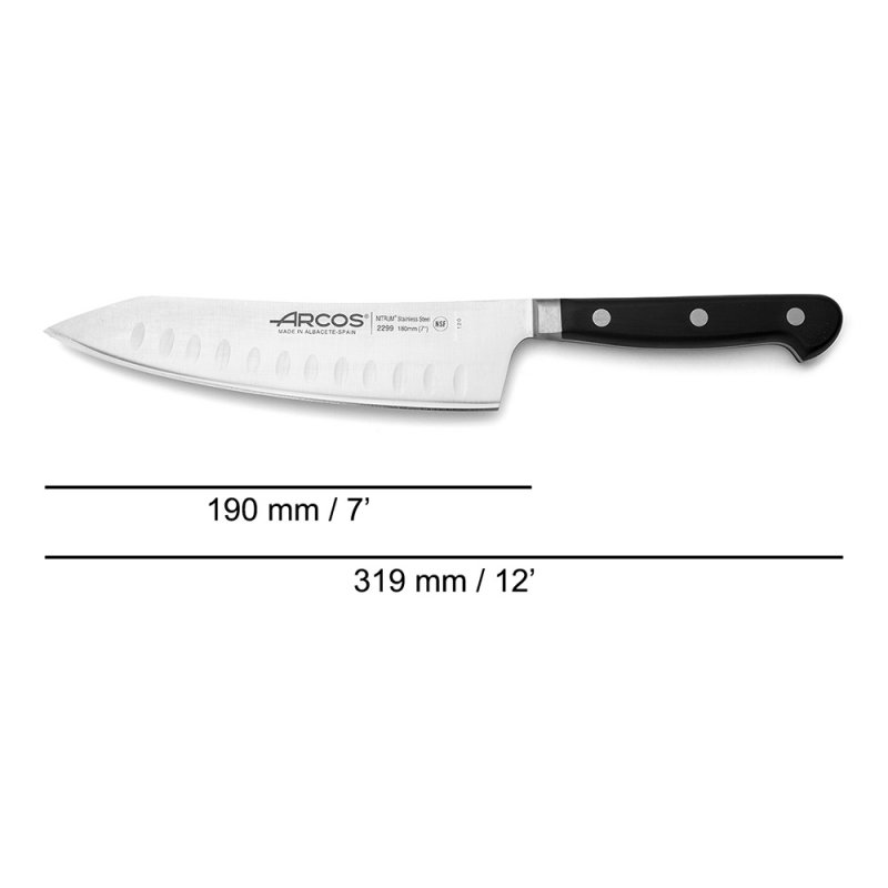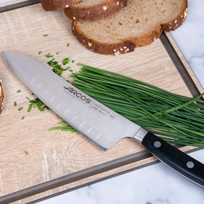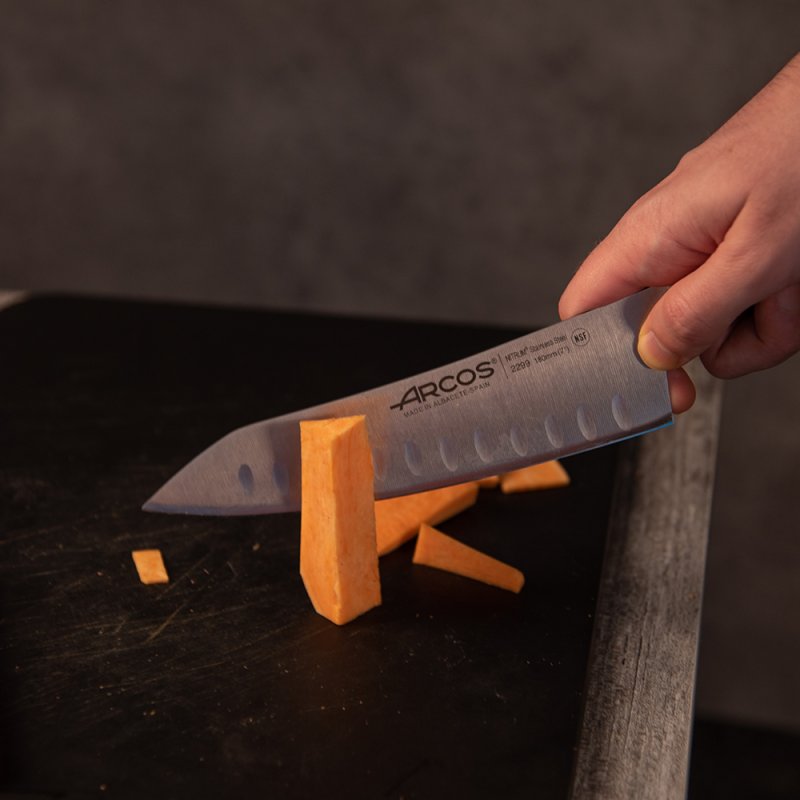 Le couteau Rocking Santoku Opéra alvéolé avec fil de lame «Silk Edge», de la marque Arcos est un accessoire indispensable pour les professionnels de la cuisine.