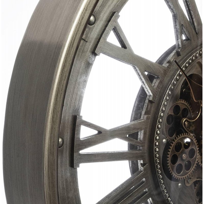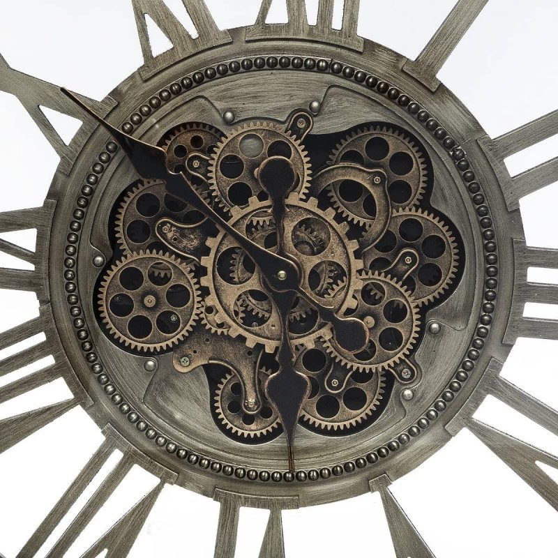 Horloge en fer gris et verre avec un mécanisme en mouvement. Elle fonctionne avec 3 piles AA LR6 non fournies.