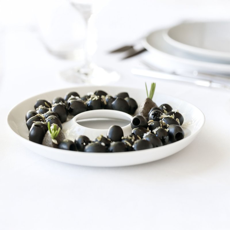 Ce ravier rond avec trou au centre est fait de porcelaine blanche.