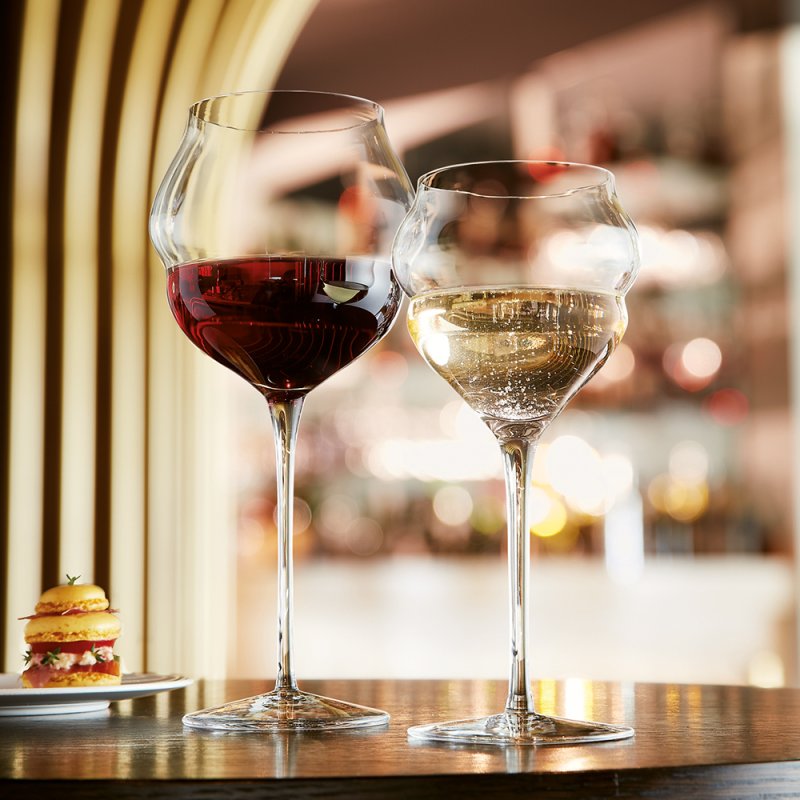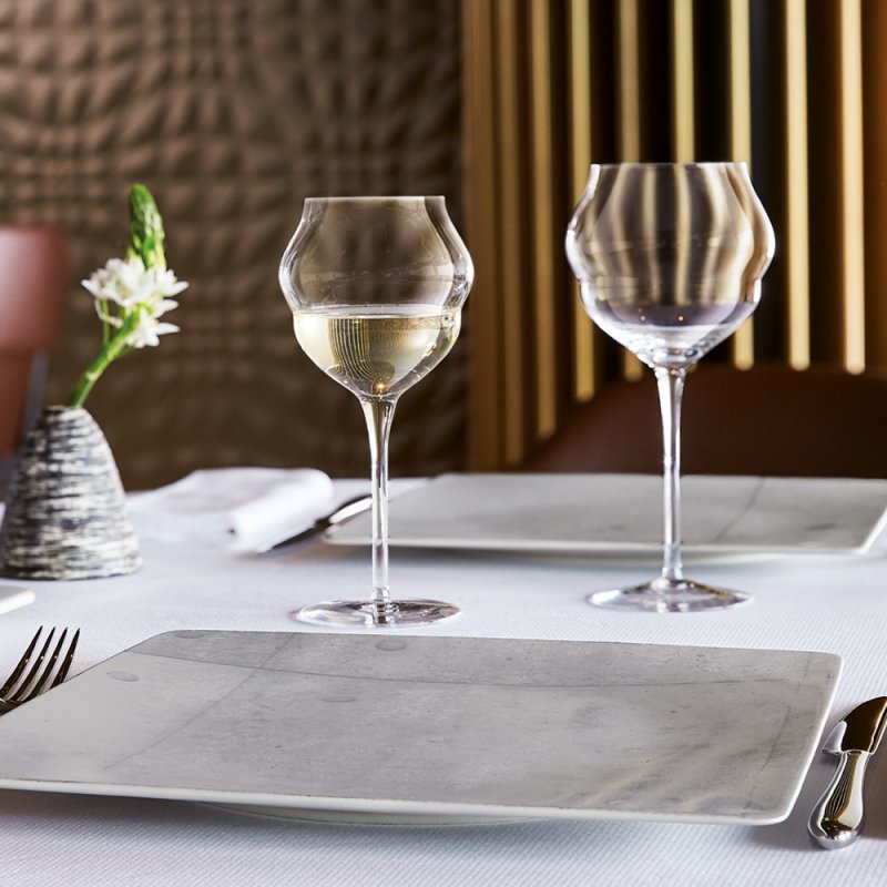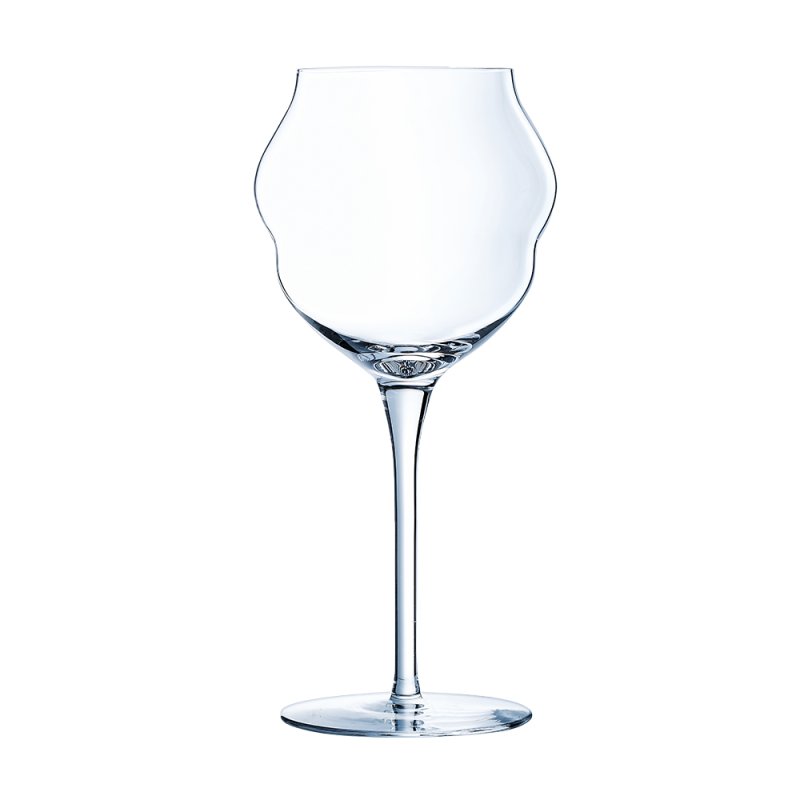 Ses formes rebondies audacieuses sont tout au service des vins : elles renforcent leur puissance par un double jeu de fermeture et d'ouverture du verre.
