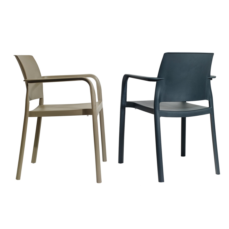 Fauteuil empilable, léger et confortable, son design de caractère vous séduira. Fauteuil empilable en polypropylène renforcé à la fibre de verre et traité anti-UV. Patins antidérapants.