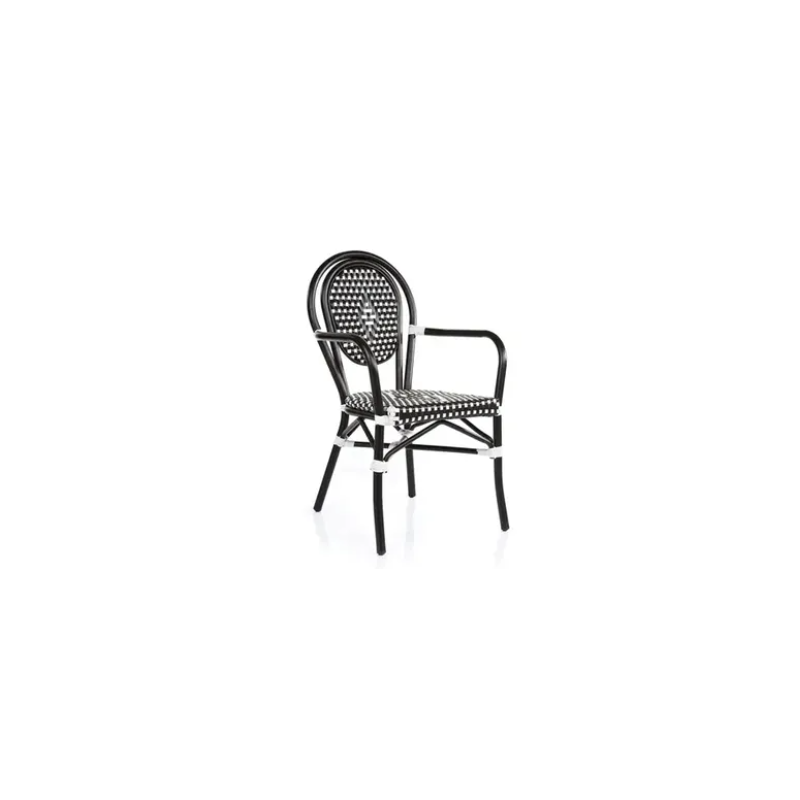 Le fauteuil empilable de la collection Bamboo est doté d'une structure en aluminium de couleur noire. Son assise et son dossier sont réalisés avec un tressage noir/blanc. Ce fauteuil est conçu pour résister aux intempéries et bénéficie d'un traitement anti-UV. Son piètement est pourvu d'un embout en plastique noir, ajoutant à la fois stabilité et esthétisme.