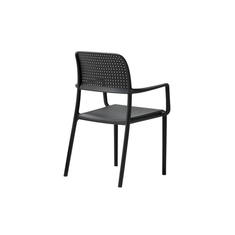 Donnez du caractère à votre terrasse avec le fauteuil BORA avec dossier et assise ajourés par de petits motifs ronds.