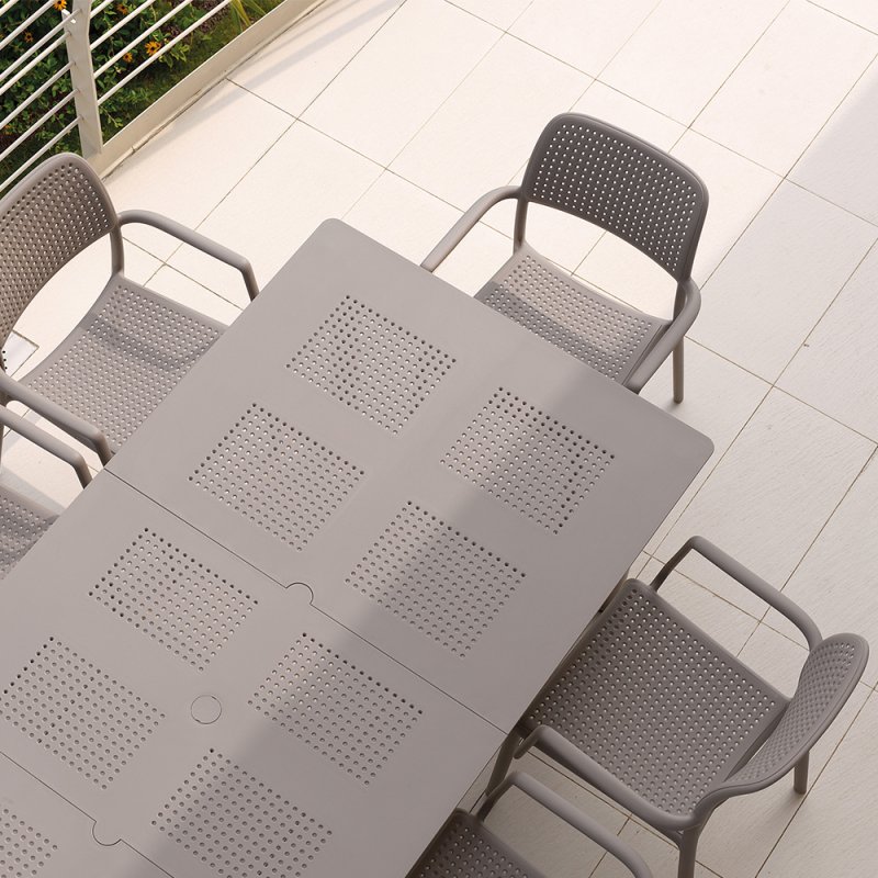 Donnez du caractère à votre terrasse avec le fauteuil BORA avec dossier et assise ajourés par de petits motifs ronds.