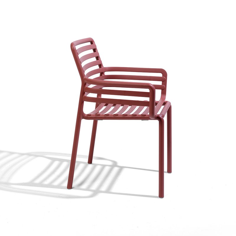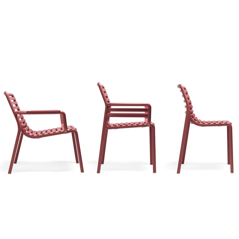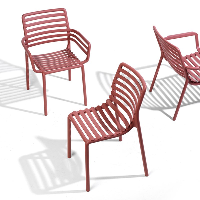 Frais, léger et ergonomique, DOGA est une collection d'extérieur en résine de fibre de verre, caractérisée par un jeu de lattes horizontales, revisitée avec une touche contemporaine.