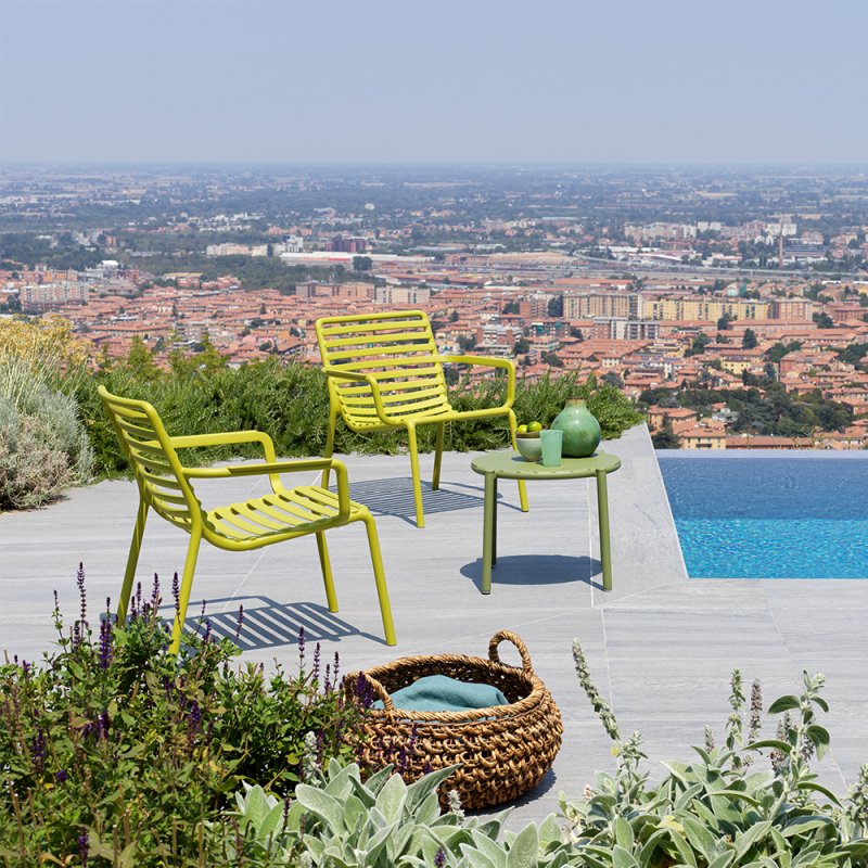 Frais, léger et ergonomique, DOGA est une collection d'extérieur en résine de fibre de verre, caractérisée par un jeu de lattes horizontales, revisitée avec une touche contemporaine.