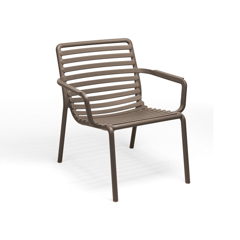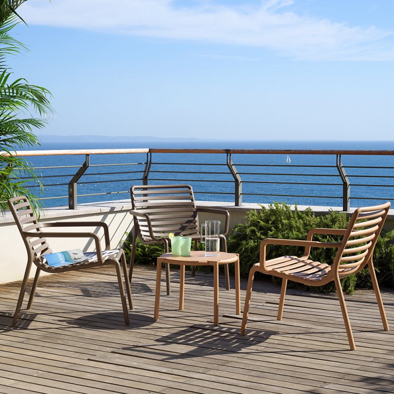 Frais, léger et ergonomique, DOGA est une collection d'extérieur en résine de fibre de verre, caractérisée par un jeu de lattes horizontales, revisitée avec une touche contemporaine.