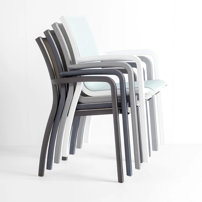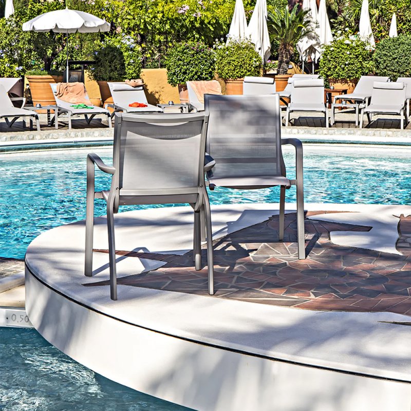 L'élégance et la pureté d'un fauteuil d'extérieur ultra confortable grâce à sa toile en textilène traitée antibactérien qui apporte souplesse et rigidité en même temps.