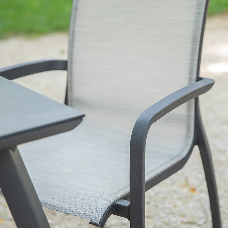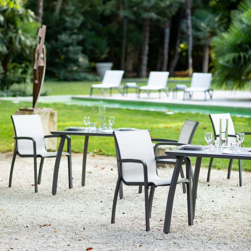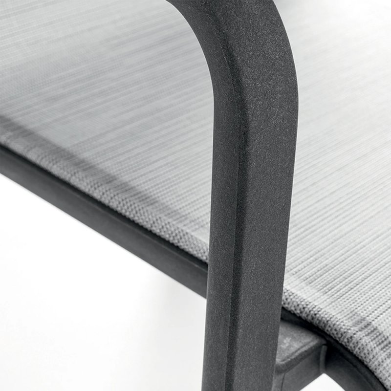 L'élégance et la pureté d'un fauteuil d'extérieur ultra confortable grâce à sa toile en textilène traitée antibactérien qui apporte souplesse et rigidité en même temps.