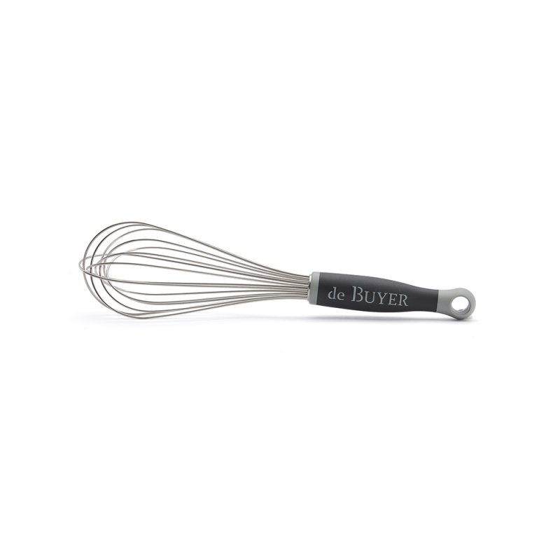 Le fouet Göma de 30 cm avec fils en acier inoxydable et manche anti-glisse de de Buyer est un ustensile indispensable en cuisine, pâtisserie, boulangerie pour toutes vos préparations : sauces, émulsions, blancs en neige, crèmes, pâtes à gâteaux. . .
