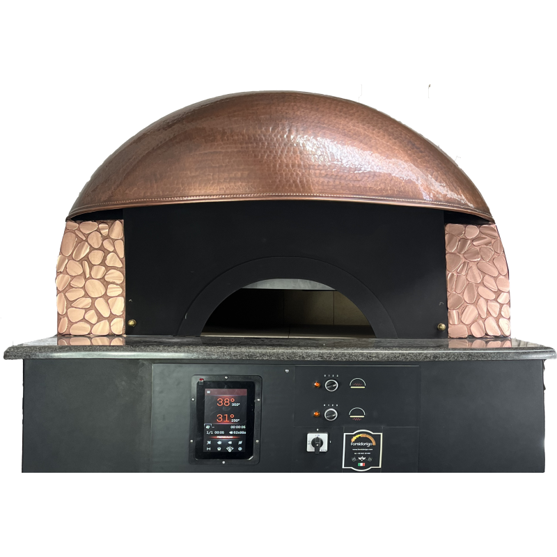 Le Four napolitain électrique, de dimensions 1420x1200x1900 mm, est spécialement conçu pour répondre aux besoins des professionnels de la restauration souhaitant produire de véritables pizzas napolitaines. Avec sa capacité à cuire jusqu'à 5 pizzas de 30 cm de diamètre ou 3 pizzas de 38 cm simultanément, ce four offre une performance exceptionnelle en atteignant jusqu'à 400°C, permettant de cuire une pizza en 90 secondes grâce à ses 12 résistances intégrées.