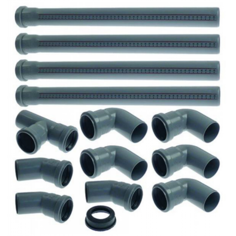 Le kit de vidange pour four professionnel comprend : un flexible coudé 3/4’’FF de 2500 mm de longueur, quatre tubes avec emboîture de ø50x500 mm, trois coudes à 45° avec joints, un manchon coulissant, un raccord en T de ø50 mm, un joint de ø60 mm extérieur et ø46/55 mm intérieur, ainsi que cinquante coudes à 90° MF.