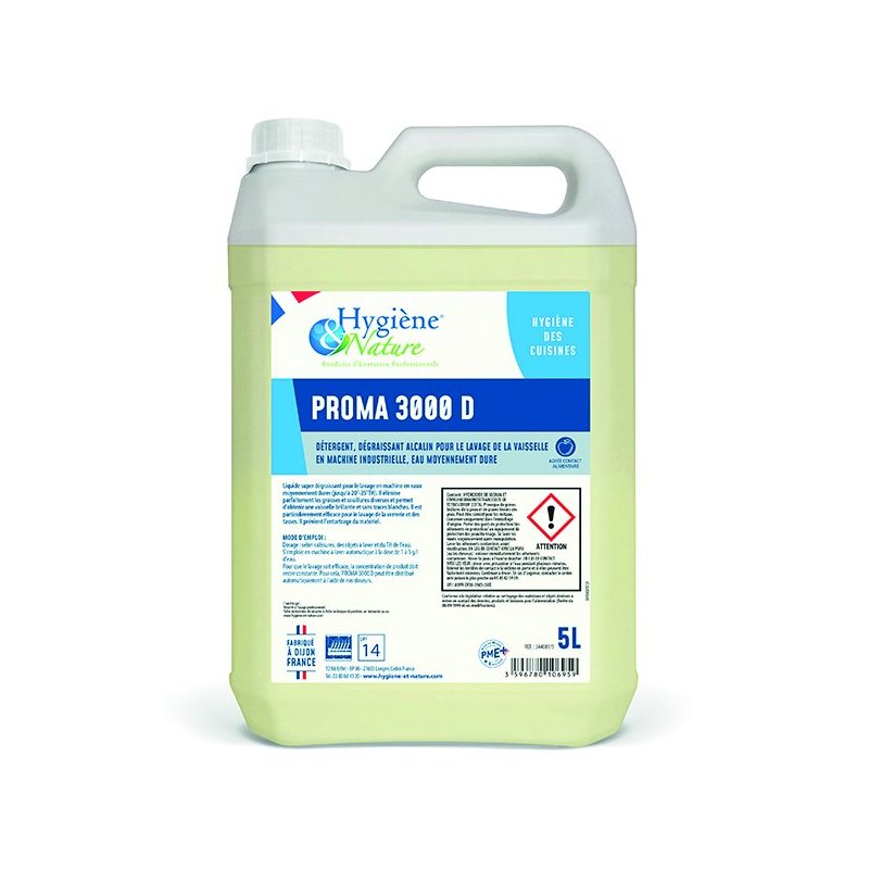 Le détergent dégraissant alcalin Proma 3000 D est spécialement conçu pour le lavage de la vaisselle dans les machines de lavage industrielles. Ce produit est formulé pour fonctionner efficacement avec de l'eau ayant une dureté allant jusqu’à 30° TH, offrant un nettoyage optimal des graisses et différentes souillures. Il est idéalement utilisé pour le nettoyage d'articles tels que la verrerie et les tasses, tout en prévenant l'entartrage du matériel de lavage.