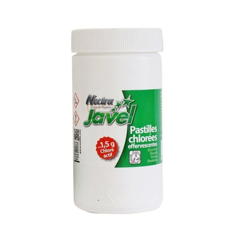 Pastilles chlorées effervescentes qui désodorisent, blanchissent, désinfectent et nettoient.