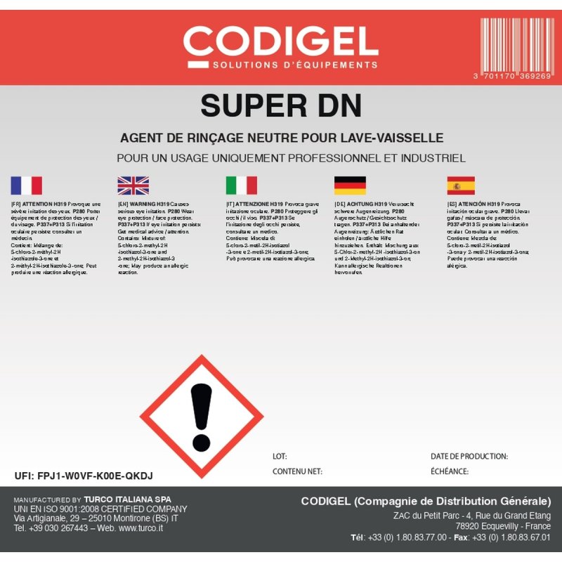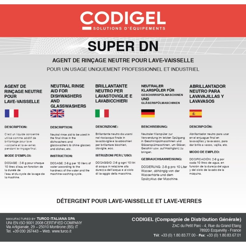 Découvrez notre agent liquide de rinçage neutre, spécialement conçu pour le cycle de rinçage final des lave-vaisselle et lave-verres équipés d'un osmoseur ou d'un adoucisseur d'eau. Ce produit innovant garantit une brillance éclatante et sans traces sur votre vaisselle, tout en préservant la qualité de vos équipements. Idéal pour les professionnels du secteur CHR (Cafés, Hôtels, Restaurants), il optimise l'efficacité de vos machines et assure une propreté impeccable à chaque utilisation.