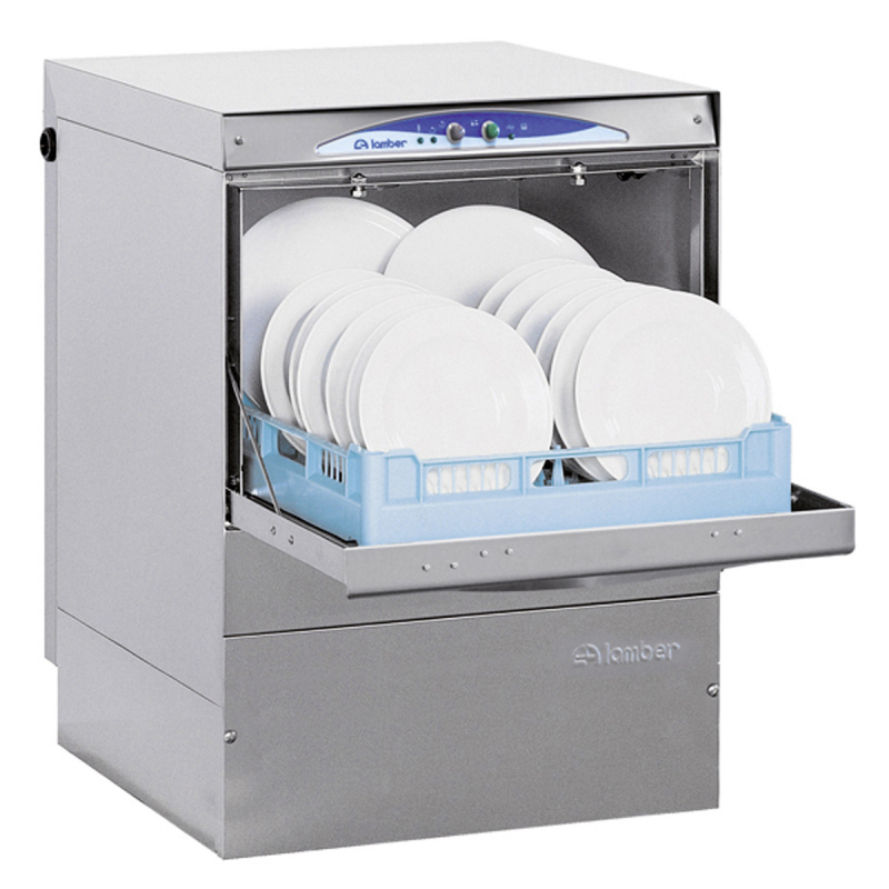 Ce lave-vaisselle professionnel, conforme aux normes CE, est livré avec un panier à assiettes, un panier générique et un godet à couverts. La carrosserie est entièrement en acier inox 18/10 AISI 304, ainsi que les tourniquets de lavage et de rinçage. Le système de rinçage comprend un rinçage inférieur rotatif et un rinçage supérieur fixe. Le remplissage de la cuve est automatique, et un dispositif de sécurité est présent à l’ouverture de la porte. Le lave-vaisselle est équipé d'un doseur de produit pour le rinçage et d'un panneau de contrôle extractible. Les filtres en cuve sont en plastique intégral. L’appareil est commutable en 230 V mono. Cet équipement professionnel est livré sans table d'entrée et de sortie.