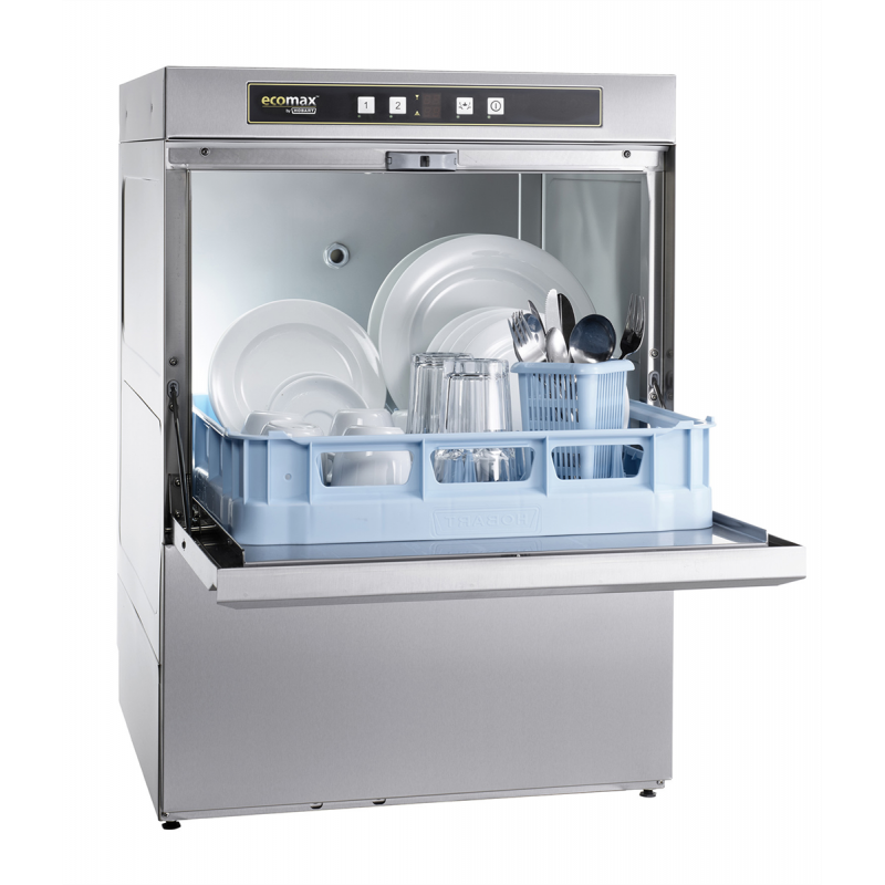 Le lave-vaisselle professionnel dispose de cycles standards de 60 et 150 secondes. Cet équipement professionnel est équipé d'un adoucisseur intégré, d'un programme d’auto-nettoyage final, ainsi que de doseurs de produits de rinçage et de détergent. Une pompe de rinçage intégrée assure une pression optimale, et la fonction thermostop garantit des températures constantes. La commande électronique avec affichage numérique des températures facilite l'utilisation. Le panneau de commande a une surface plane. Les bras de lavage et de rinçage rotatifs permettent une meilleure répartition de l’eau et peuvent être retirés sans outils spécifiques. Les buses à empreinte négative empêchent les blocages. Un port USB facilite l'accès aux informations d’entretien. Tous les accessoires sont facilement accessibles, et les supports de casiers emboutis simplifient le nettoyage. La porte isolée à double paroi se ferme en toute sécurité.