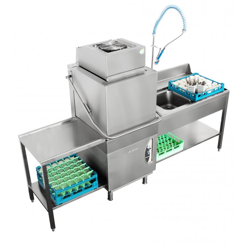 Lave-vaisselle électronique avec condenseur à buée permettant des économies d'énergies. Les doseurs de produits lessiviels et rinçage sont intégrés. Affichage graphique interactif avec programmation complète de tous les paramètres ! 60 casiers / heure. 3 cycles de lavage : 60/120/180 minutes + cycle d'assainissement renforcé. Surchauffeur 9 kW. Cuve 3 kW - 10, 1 kW. COnsommation d'eau par cycle : 2, 8L. Linéaire / angulaire. Branchement eau froide.