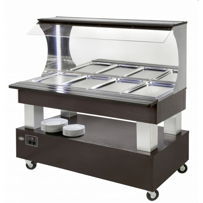 Buffet mural chauffant/bain-marie professionnel comprenant une structure en bois massif, de couleur wengué de base (avec possibilité de chêne clair ou acajou sur demande), avec un soubassement permettant le stockage des assiettes et des couverts. Il est équipé de potences en inox brossé, d'un toit doté d'un système ingénieux de retenue amovible pare-haleine sous un éclairage LED horizontal, d'une tablette de service en façade et d'un fond miroir. Doté d'un thermostat électronique, cet équipement professionnel de restauration offre une facilité d'entretien. Ce buffet professionnel peut contenir jusqu'à 4 bacs GN 1/1 d'une profondeur de 150 mm (les bacs ne sont pas inclus), et est équipé de quatre roulettes pivotantes, dont deux avec freins. Il dispose également d'un système de vidange intégré, avec une plage de température réglable de +20 à +90°C, et est équipé de deux résistances blindées de chauffe dans la cuve en inox.