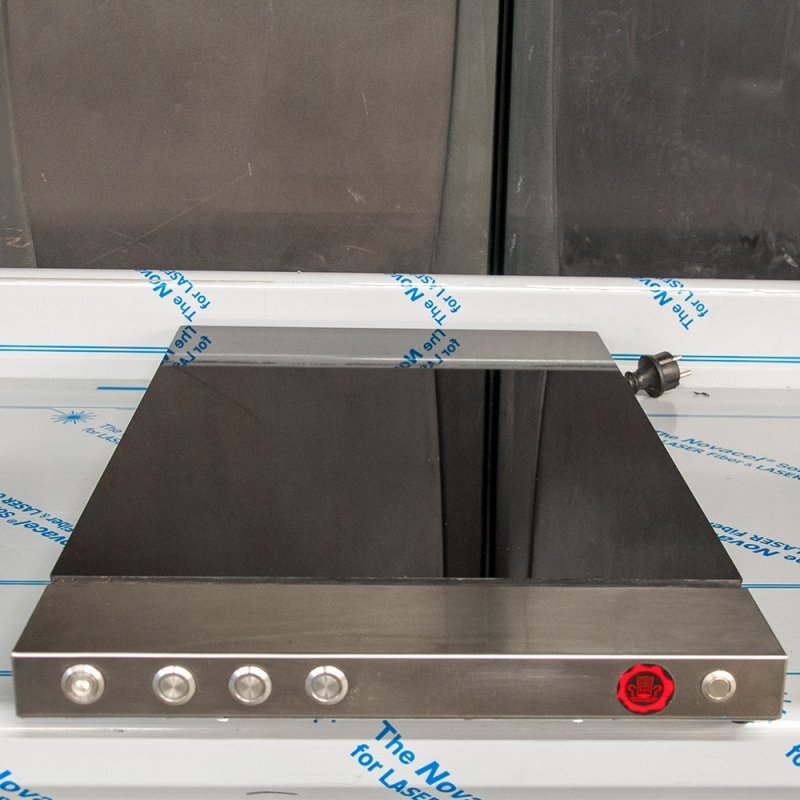 Plaque chauffante fabriquée en inox brossé « haute qualité ». Cette plaque, par son élégance et son design novateur, met en valeur vos produits et vos plats. Sa surface de travail (aux normes pâtissières) est de 600 x 400 mm. Pour faciliter votre travail, la plaque est conçue pour poser des bacs gastronormes GN 1/1 mais aussi pour découper directement vos produits (pizzas, quiches, tourtes, tartes; etc) dessus. Le panneau de contrôle constitué de 4 boutons tactiles est simple et esthétique : 1 bouton pour la mise sous tension de la plaque et 3 boutons préréglés pour choisir la température. Ultra plate, elle mesure 3 cm d'épaisseur, ce qui la rend unique sur le marché ! La répartition homogène et le contrôle de la température sur l'ensemble de la plaque est idéale grâce à 12 thermostats préréglés placés sous la vitre, c'est la garantie d'une chaleur constante. Le système de chauffe est constitué de résistances ultrafines incorporées à un tissu de silicone, en contact direct avec la plaque, à haut pouvoir de répartition thermique.