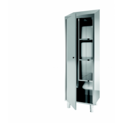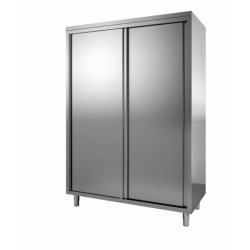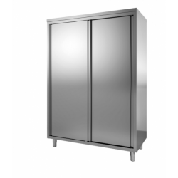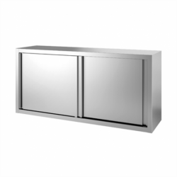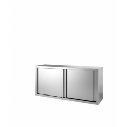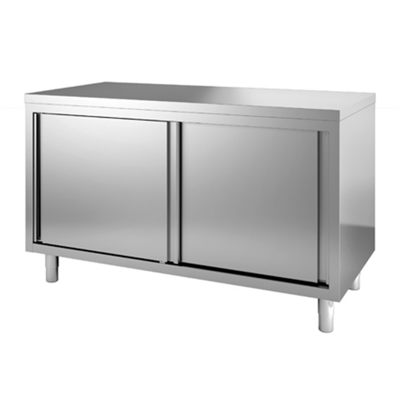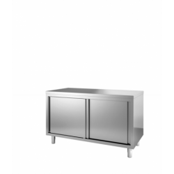 Équipé de portes coulissantes doublées, cet équipement professionnel dispose d'un dosseret mesurant 100 x 20 mm. Le dessus du meuble est muni d'un bord de 40 mm, renforcé par un panneau insonorisé et hydrofuge de 18 mm. L'étagère intermédiaire est ajustable.