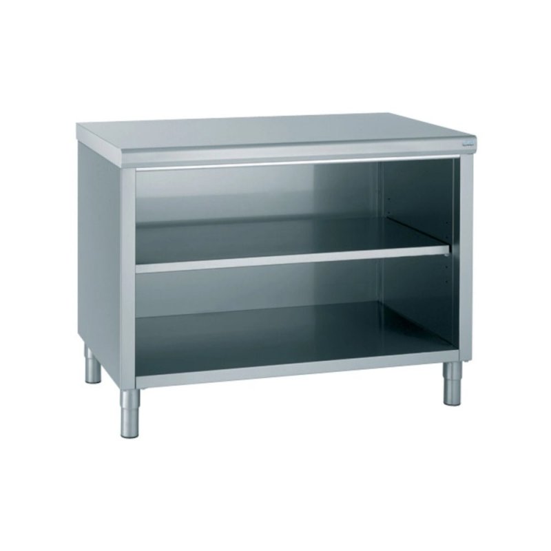 Meuble sans portes fabriqué en acier inoxydable de qualité alimentaire. Les cotés sont doublés, le plan de travail est aussi doublé par panneau stratifié collé au double face. Le bandeau avant est rayonné et les angles sont soudés. Pour faciliter le rangement à l'intérieur, le meuble dispose d'une étagère réglable dont la charge maximale est de 160 kg.