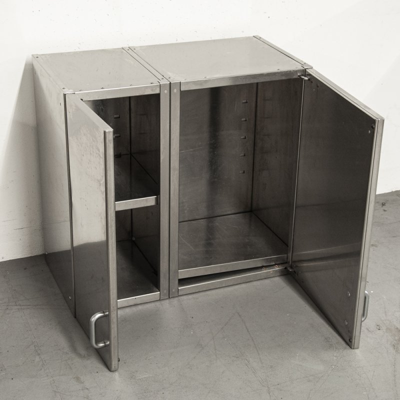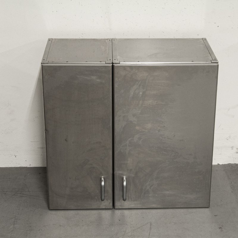 Ce meuble suspendu à dessus plat est fabriqué en acier inoxydable et équipé de deux portes battantes.