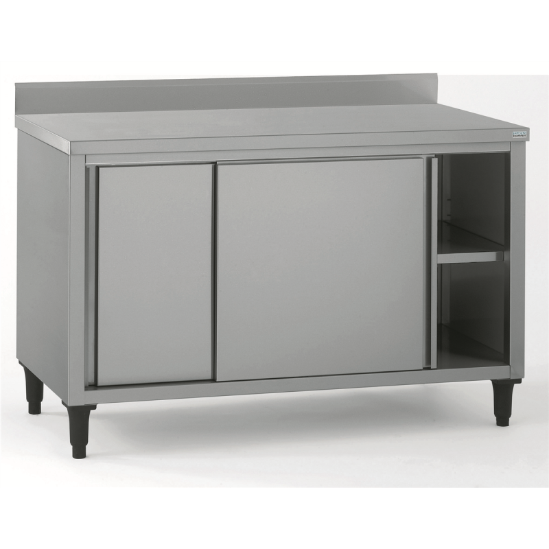 Meuble neutre à portes coulissantes professionnel en acier inoxydable avec un dessus doublé par un panneau stratifié hydrofuge. Il est doté d’un bandeau avant de 40 mm de hauteur avec bords droits et d’un dosseret plié de 100 mm de hauteur. Les portes coulissantes doubles sont équipées d'une butée en fin de course. Le meuble professionnel comprend une étagère intermédiaire réglable. Il repose sur des pieds en polyamide de 155 mm de hauteur, avec des vérins à filetage non apparent. Cet équipement professionnel est livré sur palette, protégé par un film plastique.