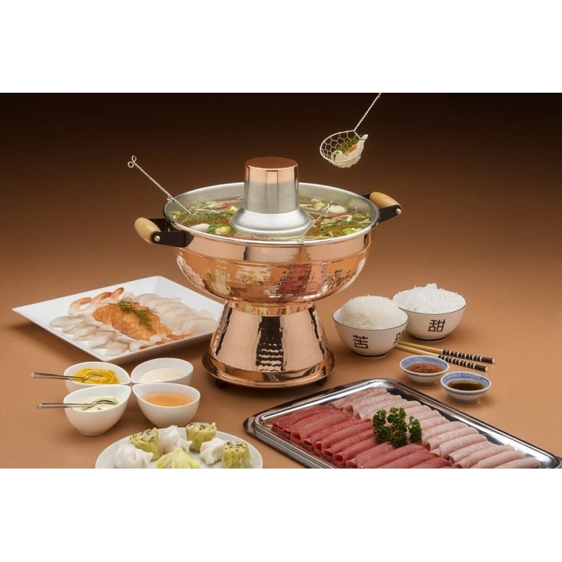Robuste de qualité professionnelle, dans le respect des traditions ! Parfait pour les restaurateurs, ce modèle de fondue chinoise électrique en cuivre martelé, d'une capacité de 3, 5 L et d'une puissance de 1200 W, assure durabilité et permet la cuisson de divers aliments dans un bouillon chaud.