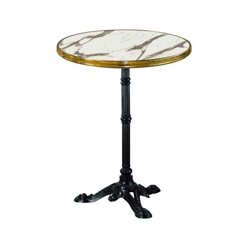 Pack composé d'un plateau cerclé de diamètre 60 cm en finition marbre blanc et cerclage en laiton + Pied Retro noir 3 branches.