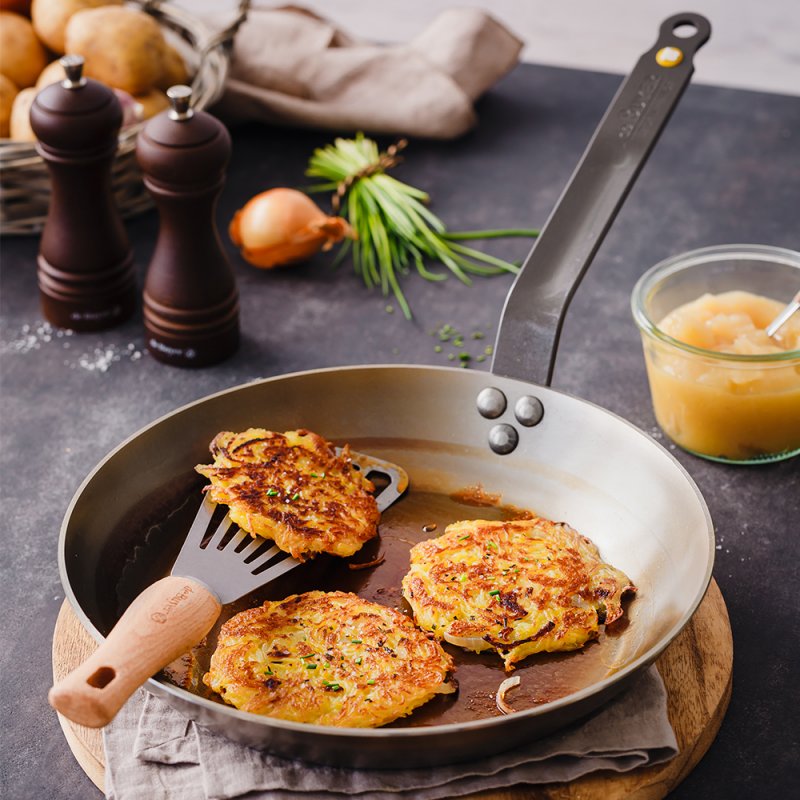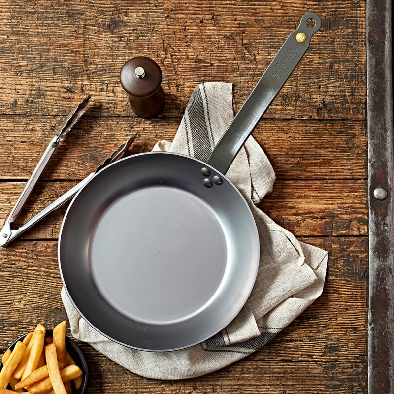 La poêle Mineral B Ø. 24cm en acier est idéale pour les professionnels du secteur CHR, avec sa coupe lyonnaise elle permet de faire glisser facilement les aliments dans un plat ; idéale pour saisir, griller, dorer.