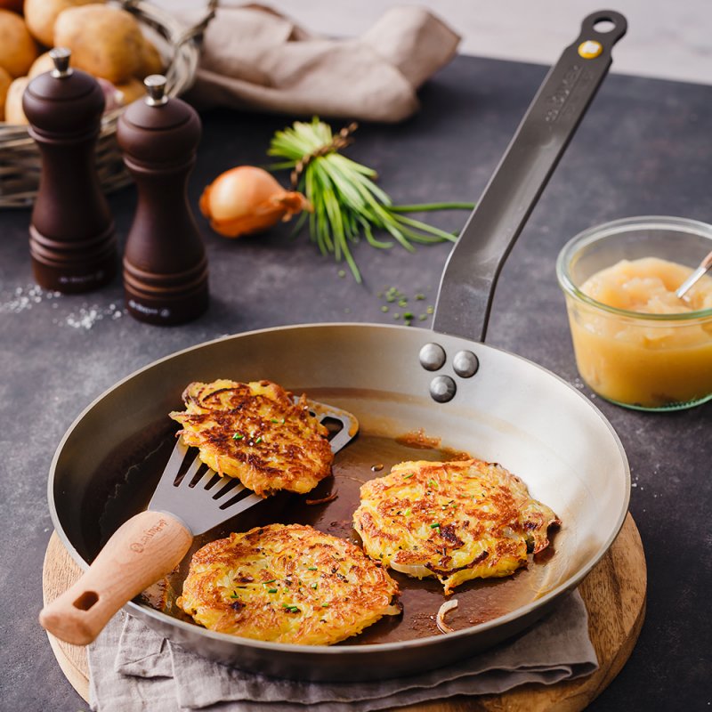 La poêle Mineral B Ø. 28cm en acier est idéale pour les professionnels du secteur CHR, avec sa coupe lyonnaise elle permet de faire glisser facilement les aliments dans un plat ; idéale pour saisir, griller, dorer.
