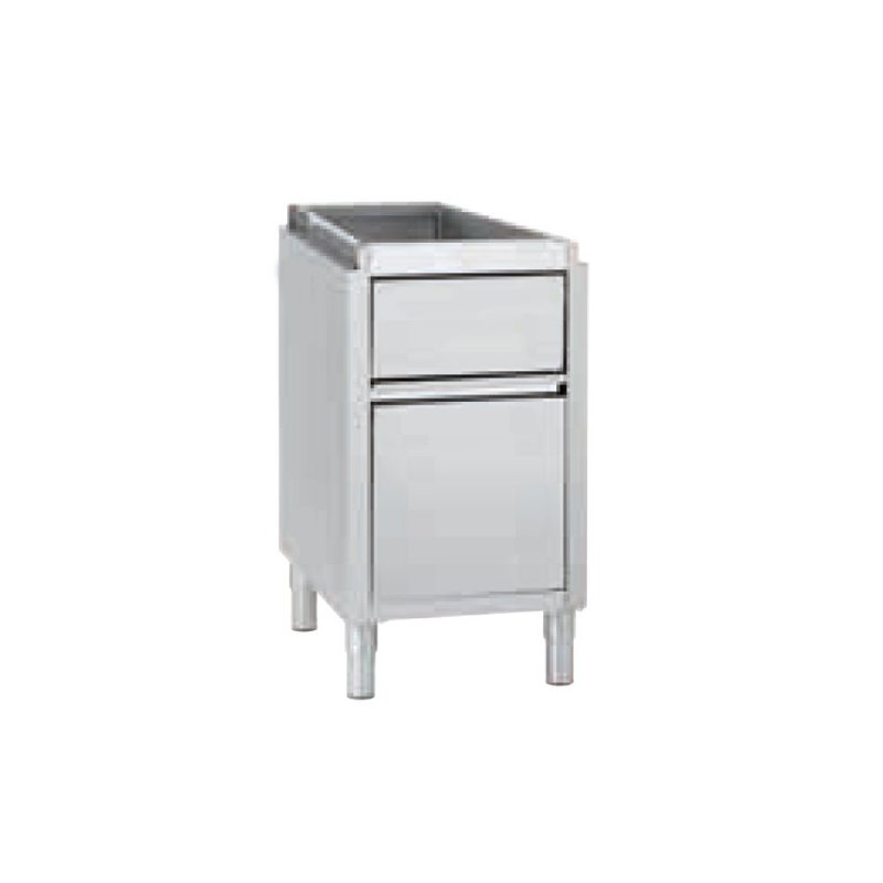 Meuble avec poubelle intégrée sans dessus. Il dispose d'un tiroir sur glissières télescopiques, comportant un support sac très rigide en méplat d’épaisseur 4 mm avec fixation du sac 50 litres par sangle élastique. La façade inox du tiroir comporte une poignée à pli écrasé.