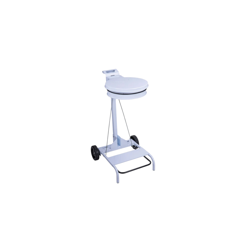 Support de sac mobile, conçu principalement pour les environnements professionnels où l'hygiène et l'efficacité sont primordiales. Fait en acier blanc, il dispose d'une base ronde et offre une capacité de soutien jusqu'à 110 litres, idéal pour gérer des déchets importants dans les secteurs comme la restauration ou les établissements médicaux. La méthode HACCP, qui est un système préventif pour garantir la sécurité alimentaire, est respectée grâce à une large pédale qui permet de ne pas toucher le support lors de son utilisation.