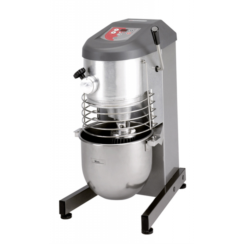 Batteur professionnel équipé d'un moteur robuste triphasé, alimenté par un variateur électronique fiable. Ce variateur permet de brancher les batteurs sur un réseau électrique monophasé. Il dispose d'une minuterie électronique réglable de 0 à 30 minutes, avec une option de fonctionnement en continu, et un avertisseur sonore en fin de cycle. La vitesse est contrôlée par variation électronique. Le batteur professionnel est doté d'une grille de protection de sécurité, et la cuve monte et descend grâce à un levier. Un double microrupteur de sécurité garantit la bonne position de la cuve et de la grille de sécurité, avec un indicateur pour signaler l'absence de protections. La protection contre les projections d'eau est renforcée. Cet équipement professionnel est muni de pieds en acier inoxydable et d'une cuve robuste et résistante. Modèle facile à entretenir et à réparer, et respecte la norme UNE-EN 454/2015.
