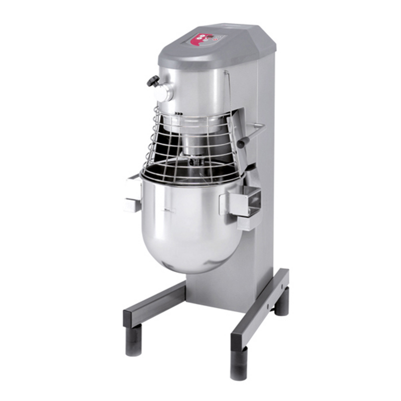 Le batteur professionnel est équipé d'une minuterie réglable pouvant aller jusqu'à 30 minutes, avec la possibilité de fonctionner en continu. Il émet un signal sonore à la fin de chaque cycle et offre une variation électronique de la vitesse. De plus, il avertit en cas de protections non activées et bénéficie d'une protection renforcée contre les projections d'eau. Ses pieds en acier inoxydable assurent une stabilité optimale, et il est pourvu d'un dispositif de sécurité de mise en route manuelle. La montée et la descente de la cuve se font aisément grâce à un levier, et cet équipement professionnel est équipé d'un double microrupteur de sécurité. Son nettoyage est facile, et il est livré avec un crochet à pétrin, une palette mélangeuse et un fouet. Ce modèle professionnel ne dispose pas de prise pour accessoires supplémentaires.