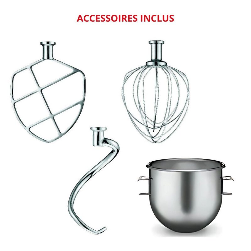 - Accessoires inclus : fouet de chef, spirale de pétrissage, palette de mélange
